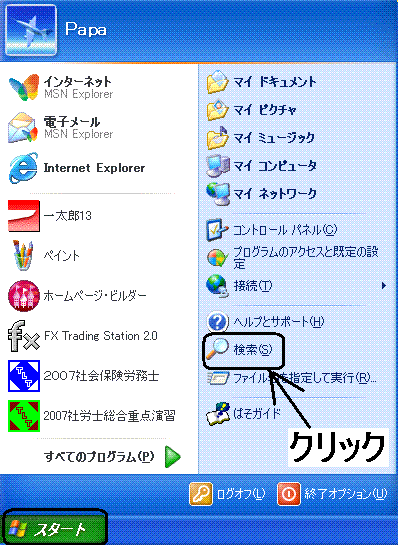 1、画面の左下の「スタート」ボタンを左クリックし、「検索」を左クリックします。